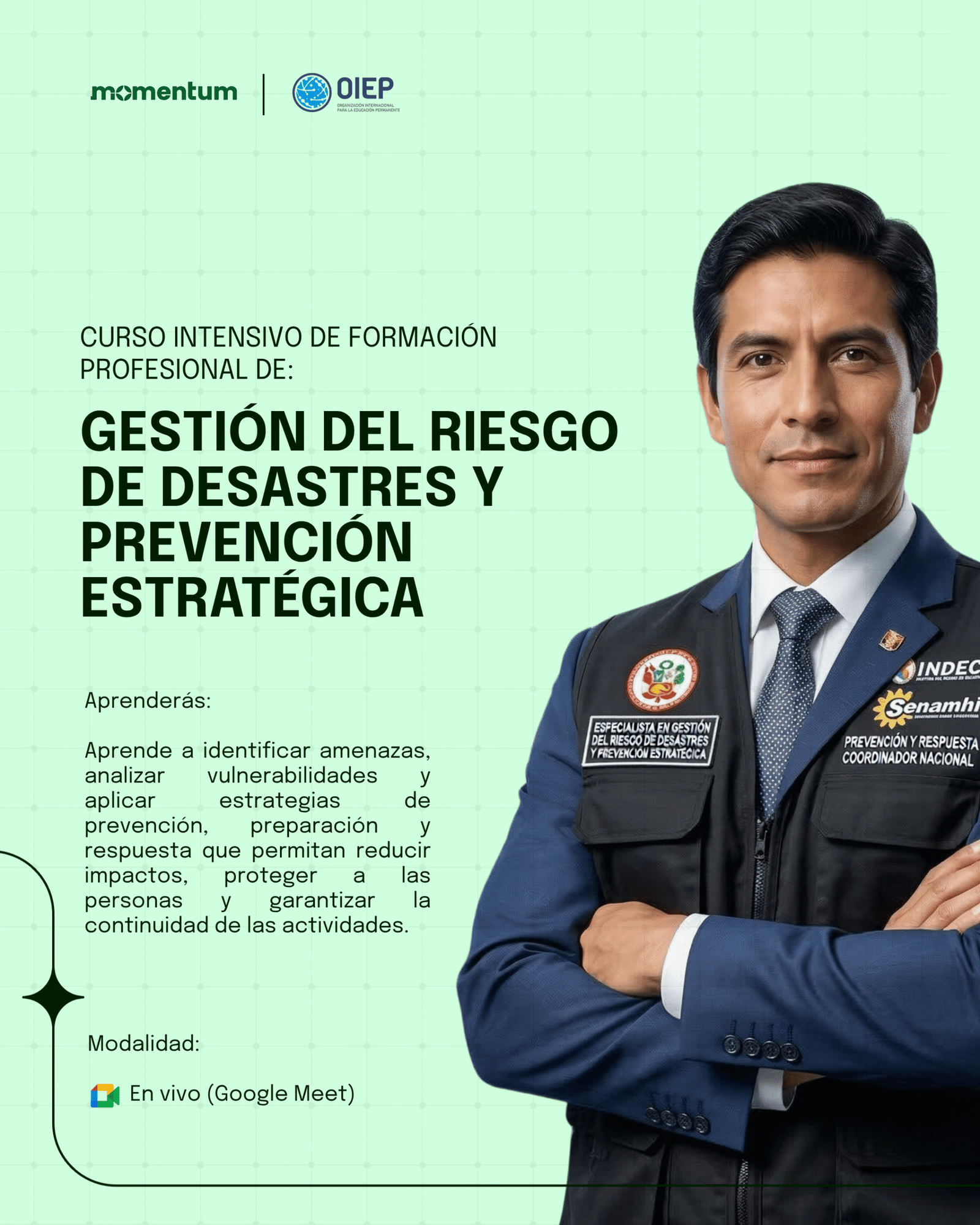 El aula virtual del curso de especialización “Gestión del Riesgo de Desastres y Prevención Estratégica”, basado en el Marco de Sendai 2015–2030, la Ley 29664 SINAGERD, D.S. 048-2011-PCM, PLANAGERD 2022–2030 e ISO 31000 / ISO 22320, ha sido diseñada bajo un enfoque técnico, estructurado y orientado a resultados.