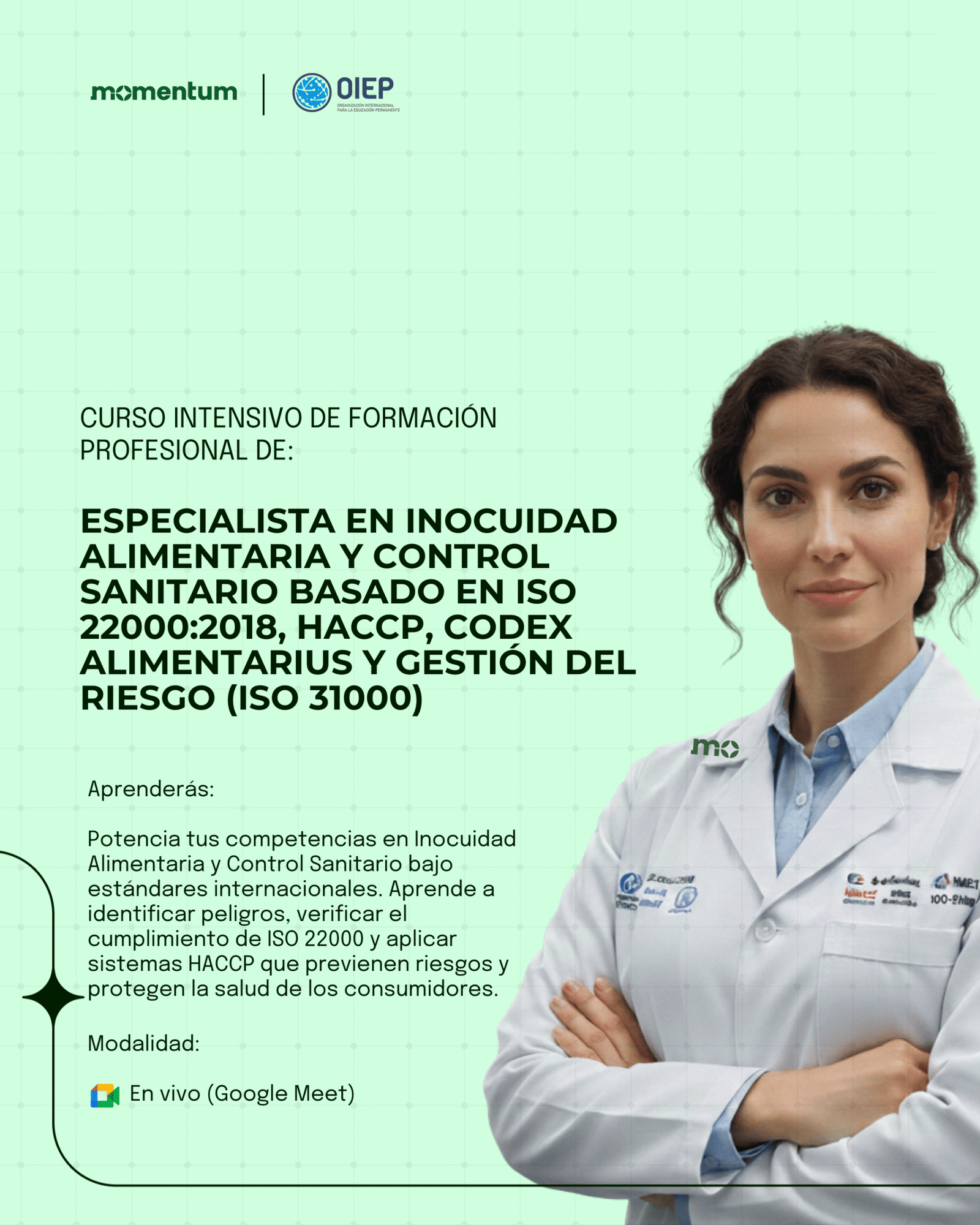 Programa de especialización diseñado para formar profesionales capaces de implementar, auditar y fortalecer Sistemas de Gestión de Inocuidad Alimentaria bajo la norma ISO 22000:2018 de la International Organization for Standardization, integrando los principios del sistema HACCP y las directrices del Codex Alimentarius Commission.